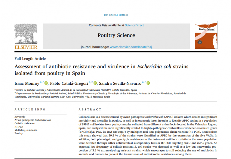 Monroy y col. Assessment of antibiotic resistance and virulence in Escherichia coli strains isolated from poultry in Spain. Poultry Science, Volume 104, Issue 2, February 2025, 104838.